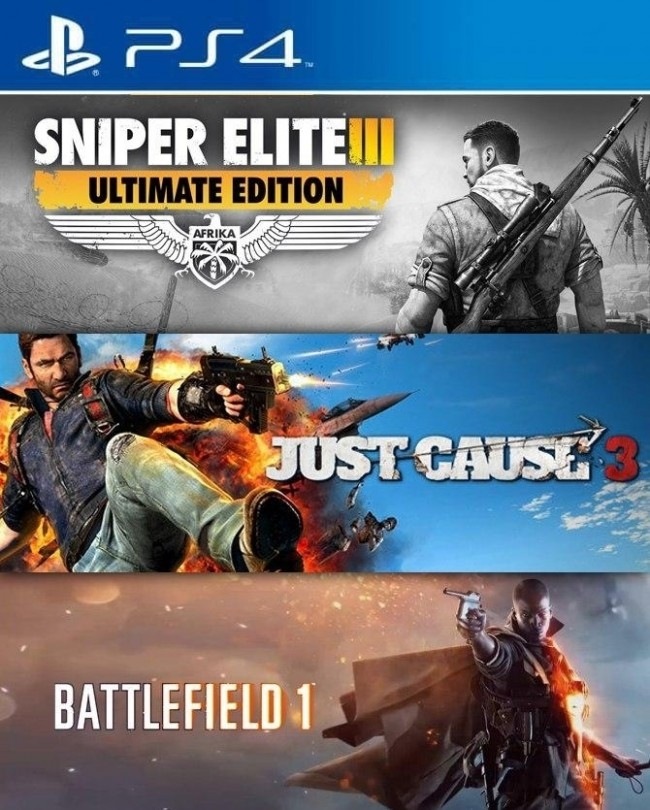 3 JUEGOS EN 1 SNIPER ELITE III ULTIMATE EDITION MAS JUST CAUSE 3 MAS BATTLEFIELD 1 PS4