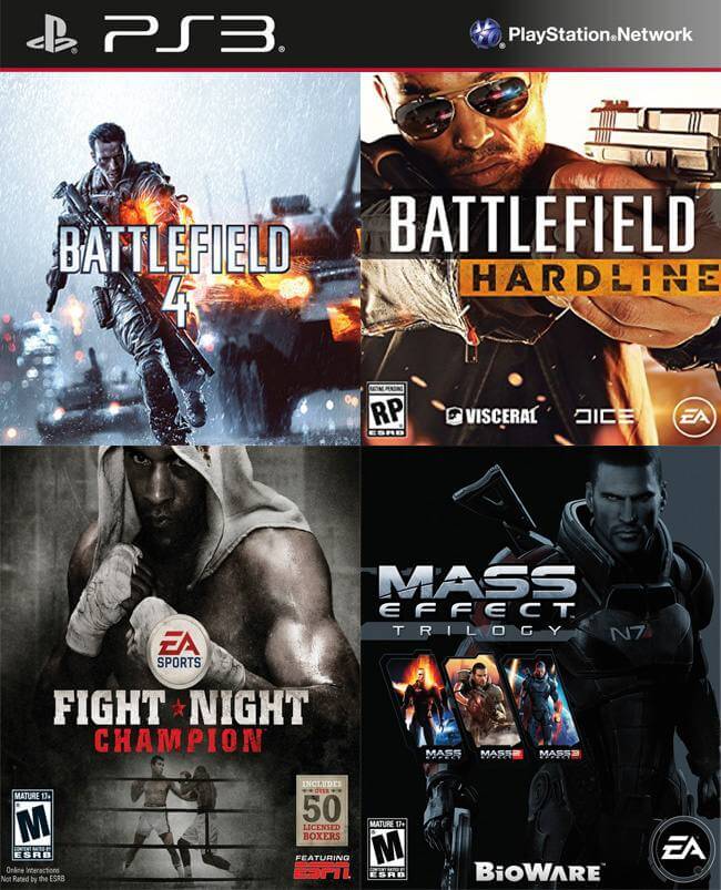 4 juegos en 1 Battlefield 4 mas Battlefield Hardline Standard Edition mas Fight Night Champion mas Mass Effect Trilogy ps3