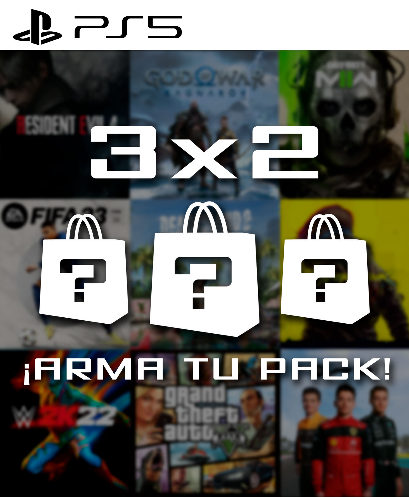 Al realizar la compra podrás escoger 3 juegos de PS5 individual en cuenta secundaria de nuestro catálogo sin importar precio de diferencia que tengan entre ellos.