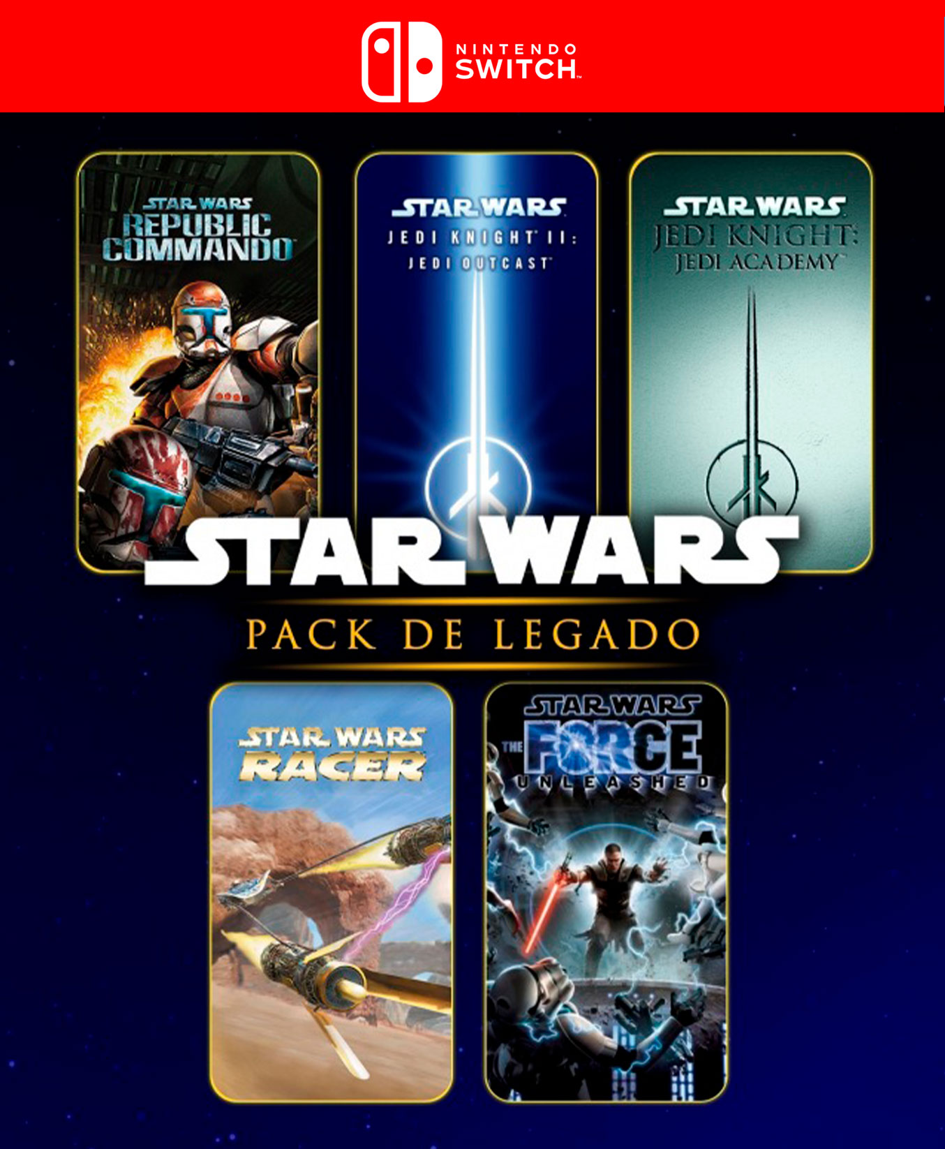 • Idiomas: Japonés, Inglés, Español, Francés, Alemán, Chino • Espacio necesario: 38.8 GB • Contiene: - STAR WARS™ Jedi Knight II: Jedi Outcast -STAR WARS™ Jedi Knight: Jedi Academy - STAR WARS™ Episode I Racer - STAR WARS™ Republic Commando™ - STAR WARS™: The Force Unleashed™ - STAR WARS™: Knights of the Old Republic™ - STAR WARS™: Knights of the Old Republic™ II: The Sith Lords